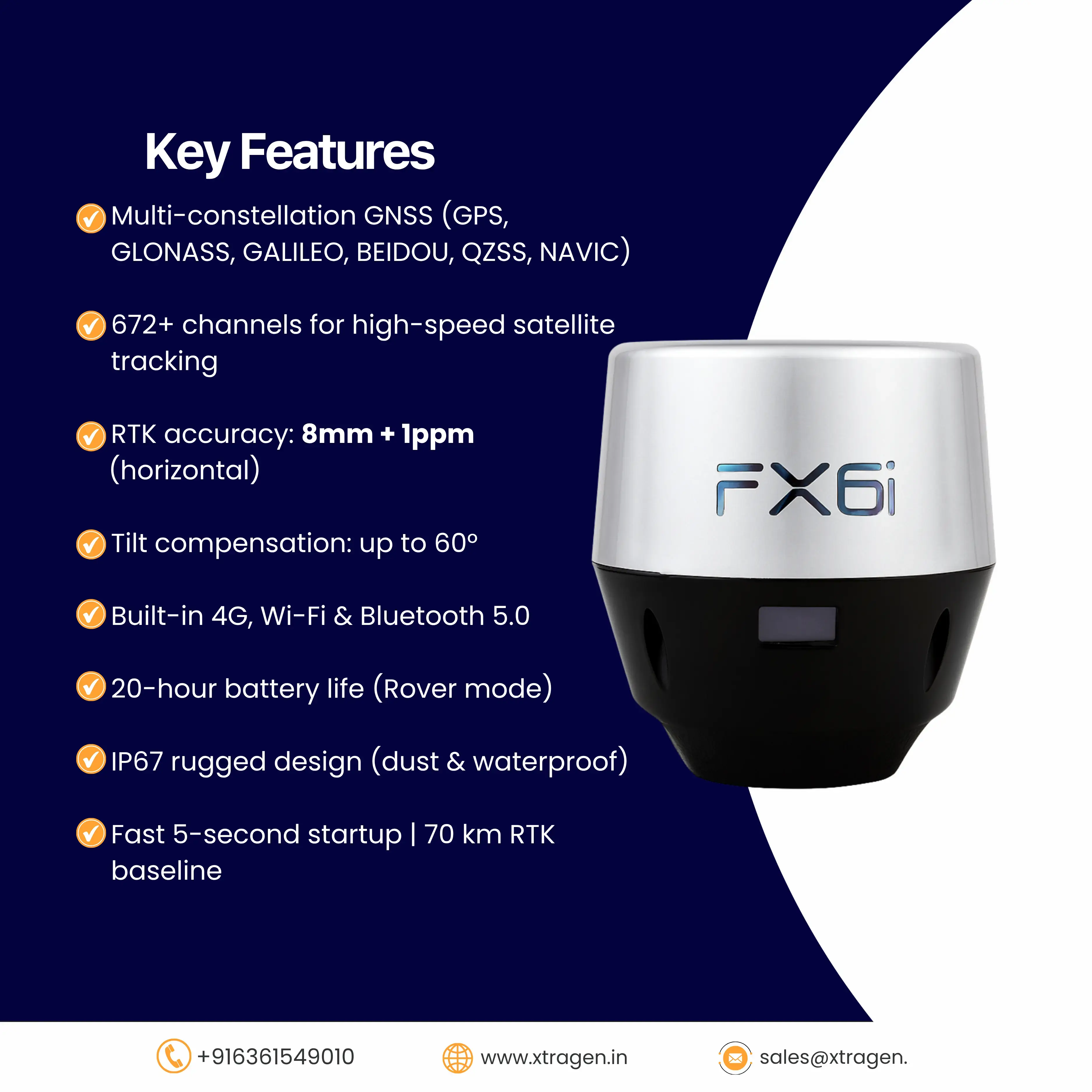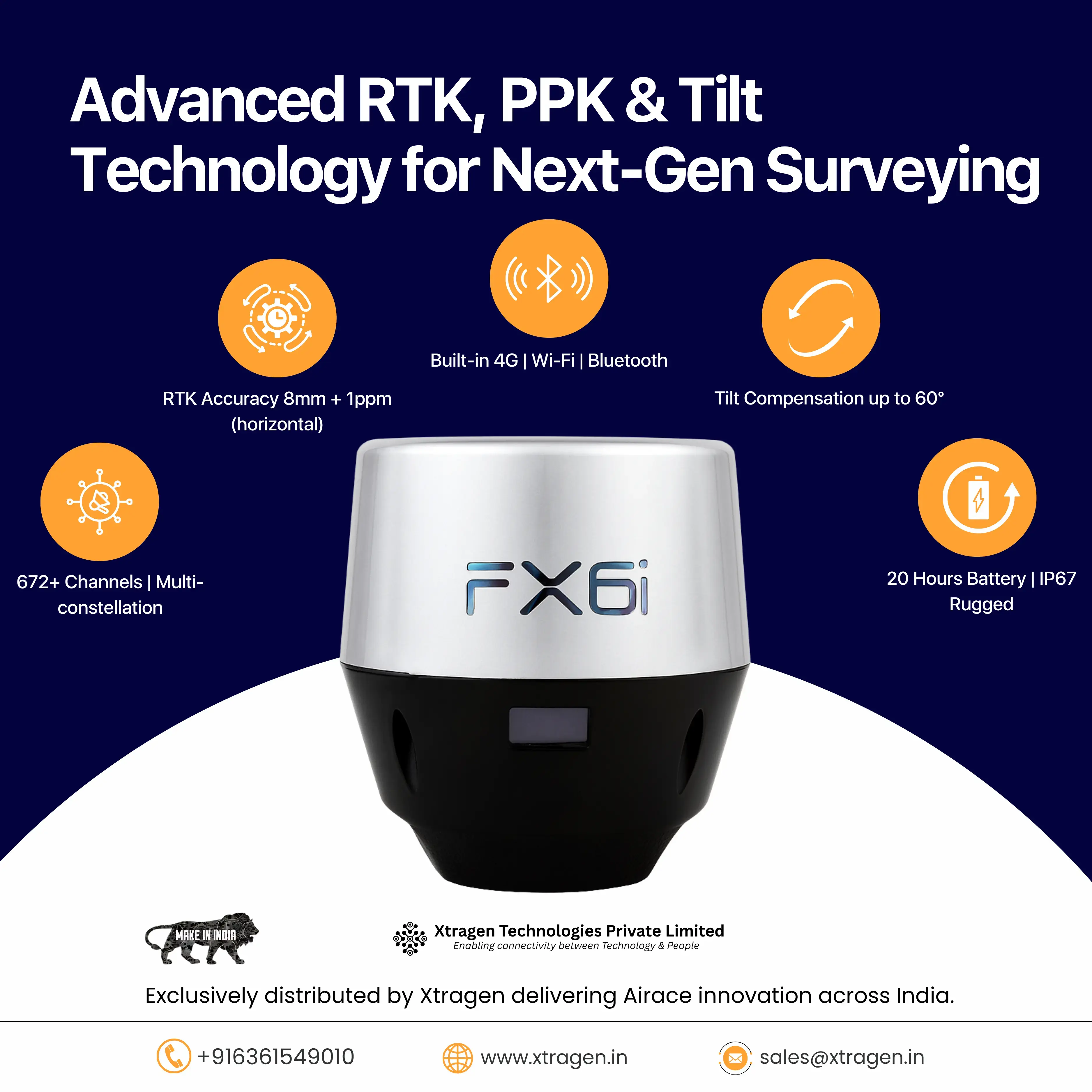 The Airace FX6i GNSS RTK Receiver is a next-generation, high-precision positioning solution designed for surveyors, engineers, GIS professionals, and industries that demand accuracy, portability, and reliability. Built with advanced tilt compensation technology, multi-constellation support, and seamless connectivity, the FX6i ensures millimeter-level accuracy even in challenging environments.